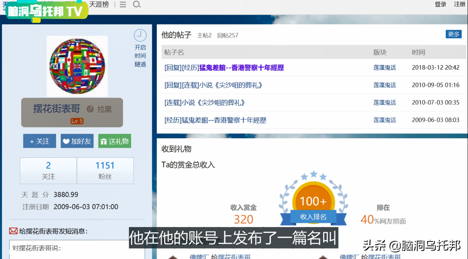 那么话说回来了,这个灵异故事的最早来源是哪里呢?它实际上最早是出现在一个著名的论坛上的,天涯社区莲蓬鬼话。作者是一个叫做摆花街表哥。他在账号上发布了一篇名叫《猛鬼差馆——香港警察十年经历》的小说,一共70多章,而《新界北之茶餐厅灵异事件》是第六章,发布时间是2009年6月8日。除了《香港警察十年经历》这部小说之外,他还在2010年发布了《尖沙嘴的葬礼》也是一部灵异小说。