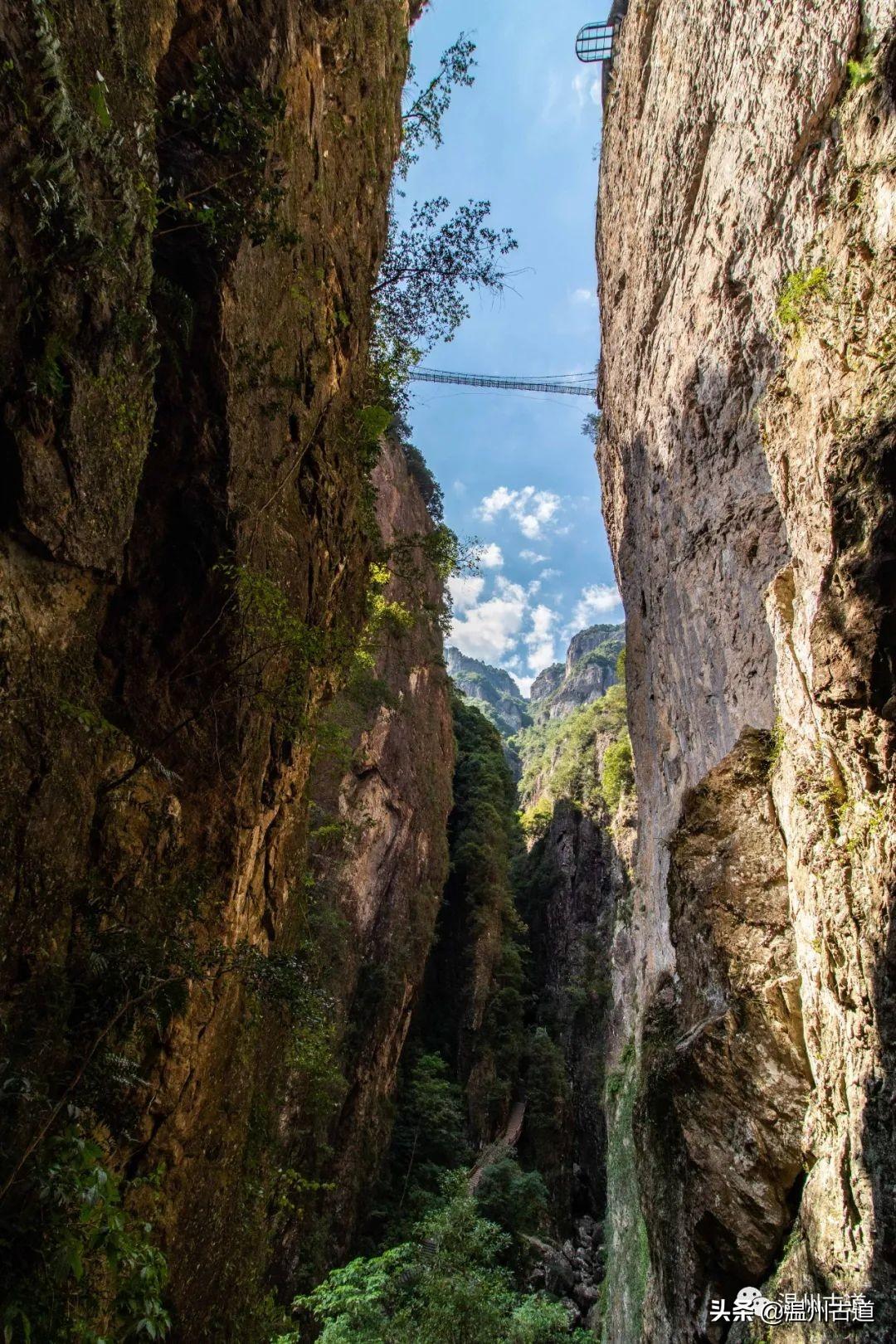 过仙人桥,沿着游步道登山,随行的朋友感叹道路陡峭。抬头仰望,两崖之上一线蓝天,大家都奋勇攀登,游步道仿佛是天梯,上面定是美景无限。